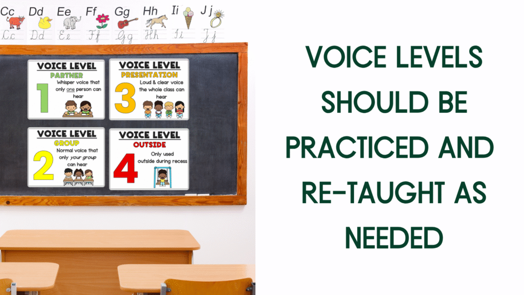 Teach what different voice levels sound like in your classroom and practice each one. Also choose your attention signal and teach it early. The goal is to get students’ attention without raising your voice.